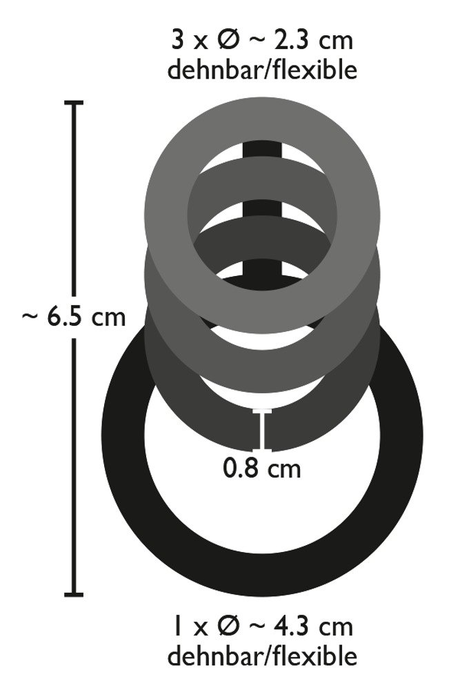Četiri prstena za penis. Promjeri prstena: 3 x 2,3 cm i 1 x 4,3 cm. Ukupna dužina: 6,5 cm. Crna. Materijal: TPE, bez ftalata u skladu s EU uredbom 1907/2006 / EC.