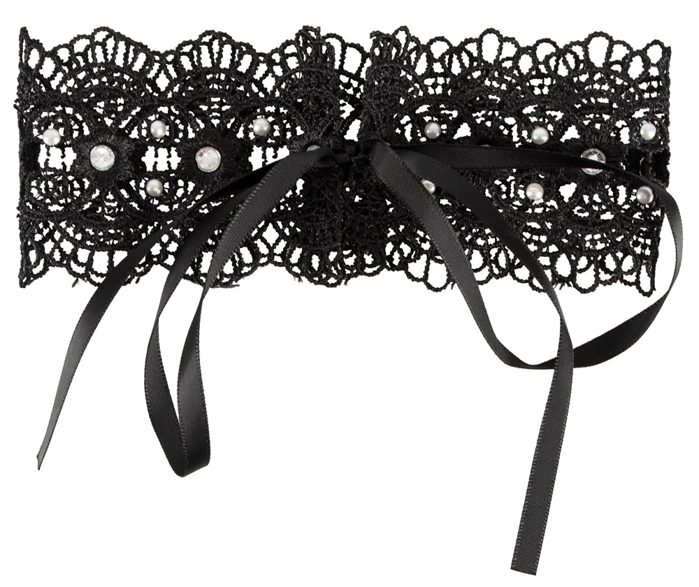 Crna izvezena ogrlica ukrašena bijelim biserima i kamenčićima. Na stražnjoj strani nalazi se satenska vrpca za vezivanje ogrlice.