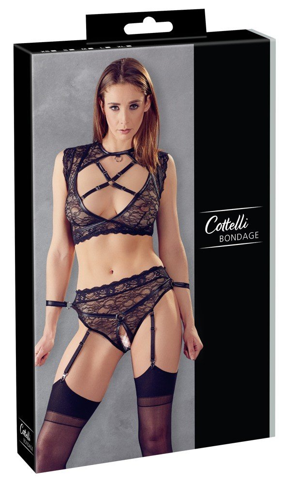 Elegantan set donjeg rublja iz serije Cottelli Bondage. Set uključuje grudnjak, podvezice i gaćice. Donje rublje izrađeno je od elastične mrežice s mat detaljima na nitnama.