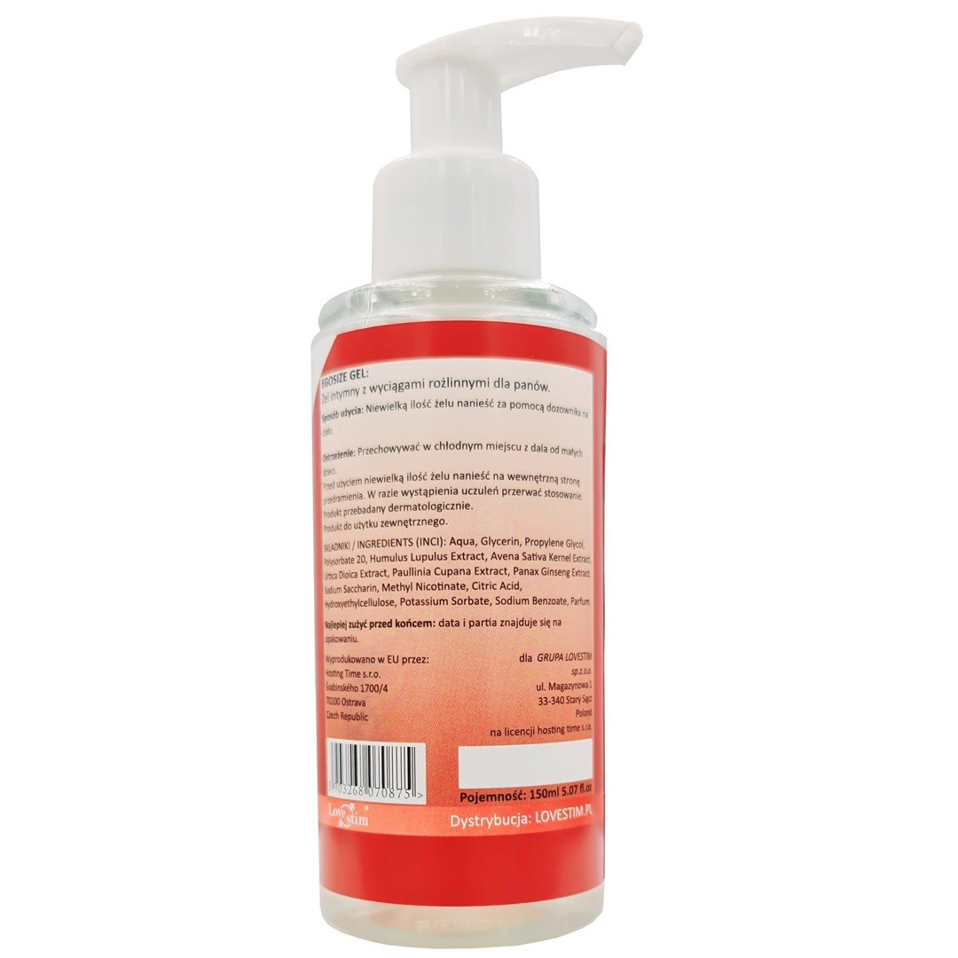 Intimni gel s ginsengom i guaranom – za povećanje penisa i jaču erekciju EGOSIZE je gel već dobro poznate marke intimne kozmetike LoveStim. Ova marka je nagrađena lovorikom potrošača. Zahvaljujući tome, pri kupnji LoveStim proizvoda možete biti sigurni da dobivate proizvod kreiran s pažnjom na svaki detalj. Tako da ispuni vaša očekivanja. EGOSIZE 150 ml je profesionalni gel s novom dodatnom formulom razvijenom posebno za muškarce koji žele poboljšati svoje seksualne performanse. Gel, zahvaljujući svojim aktivnim sastojcima, uključujući ginseng i guaranu, može doprinijeti povećanju veličine tijekom spolnog odnosa i poboljšanju erekcije. Prilikom korištenja EGOSIZE gela osjetit ćete trnce, to je znak da gel počinje djelovati. Koristite ga 10-ak minuta prije planiranog odnosa. Za to vrijeme gel bi se trebao upiti i početi djelovati.