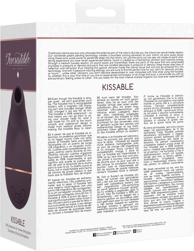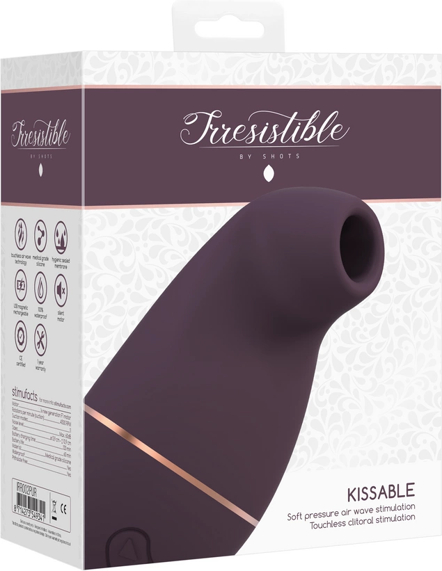 • Mekan je na dodir, gladak i vodootporan dizajn izrađen je od medicinskog silikona, što čini Kissable lakim za čišćenje. Airwave tehnologija bez dodira. Irresistible Collection nije bilo koja kolekcija seksualnih igračaka.