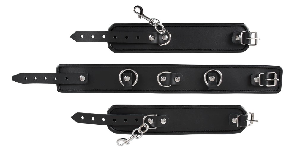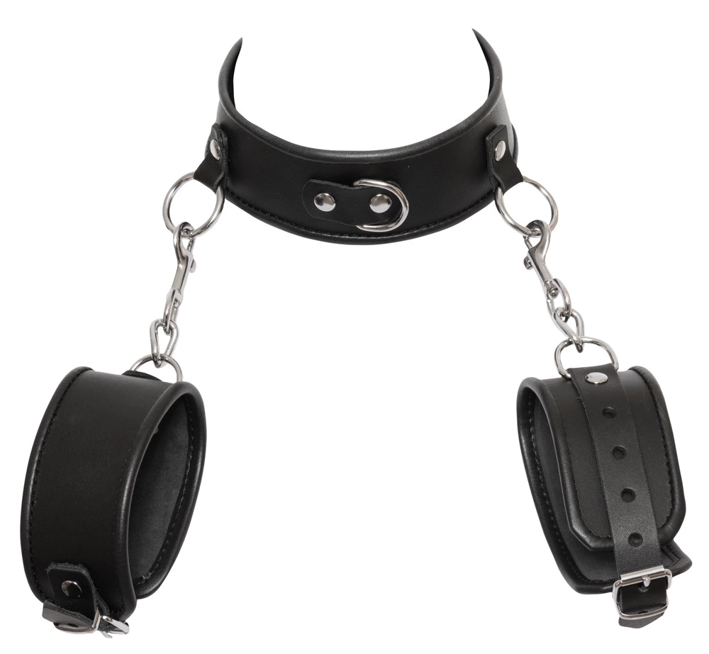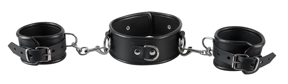 Kožna ogrlica i lisice ZADO koji se sastoji od ovratnika i 2 lisice. Lisice se mogu pričvrstiti za ovratnik pomoću karabina. Manšete također imaju prstenove sa strane i D-prsten sprijeda. Rubovi manžeta su ušiveni.