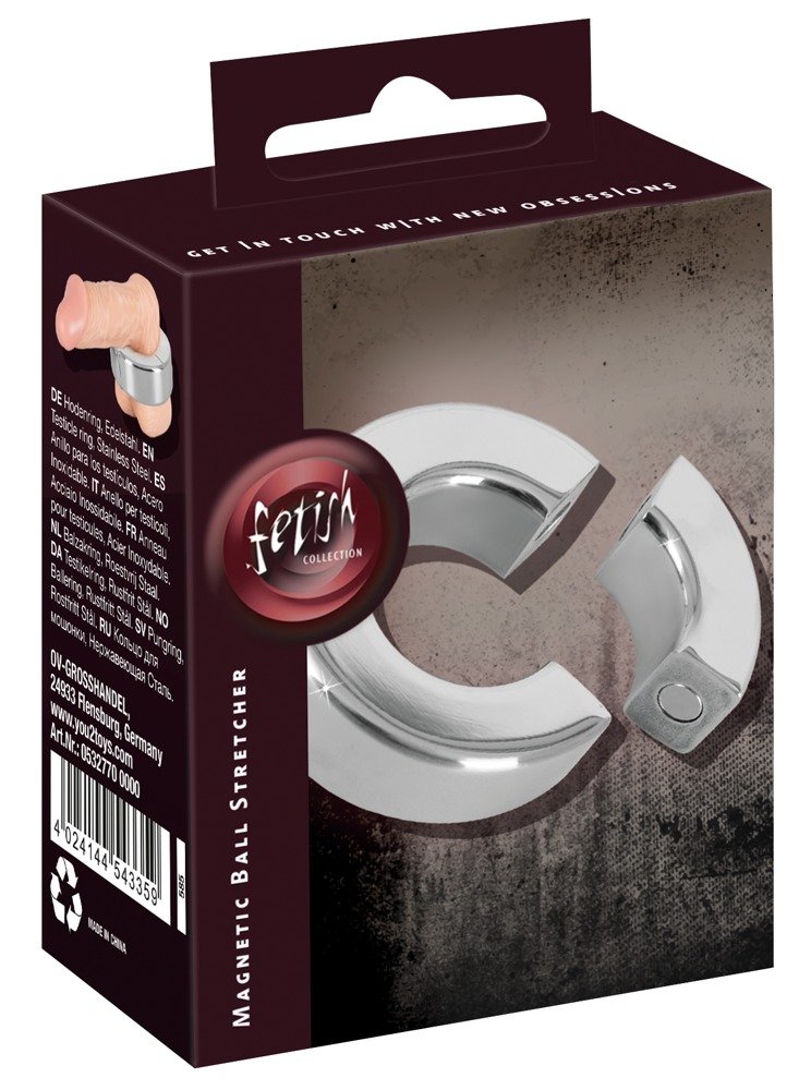 Metalni prsten za penis s magnetskim elementom za otvaranje i zatvaranje prstena. Unutarnji promjer: 34 mm. Vanjski promjer: 63 mm. Debljina: 20 mm. Težina: 341 g. Metal.