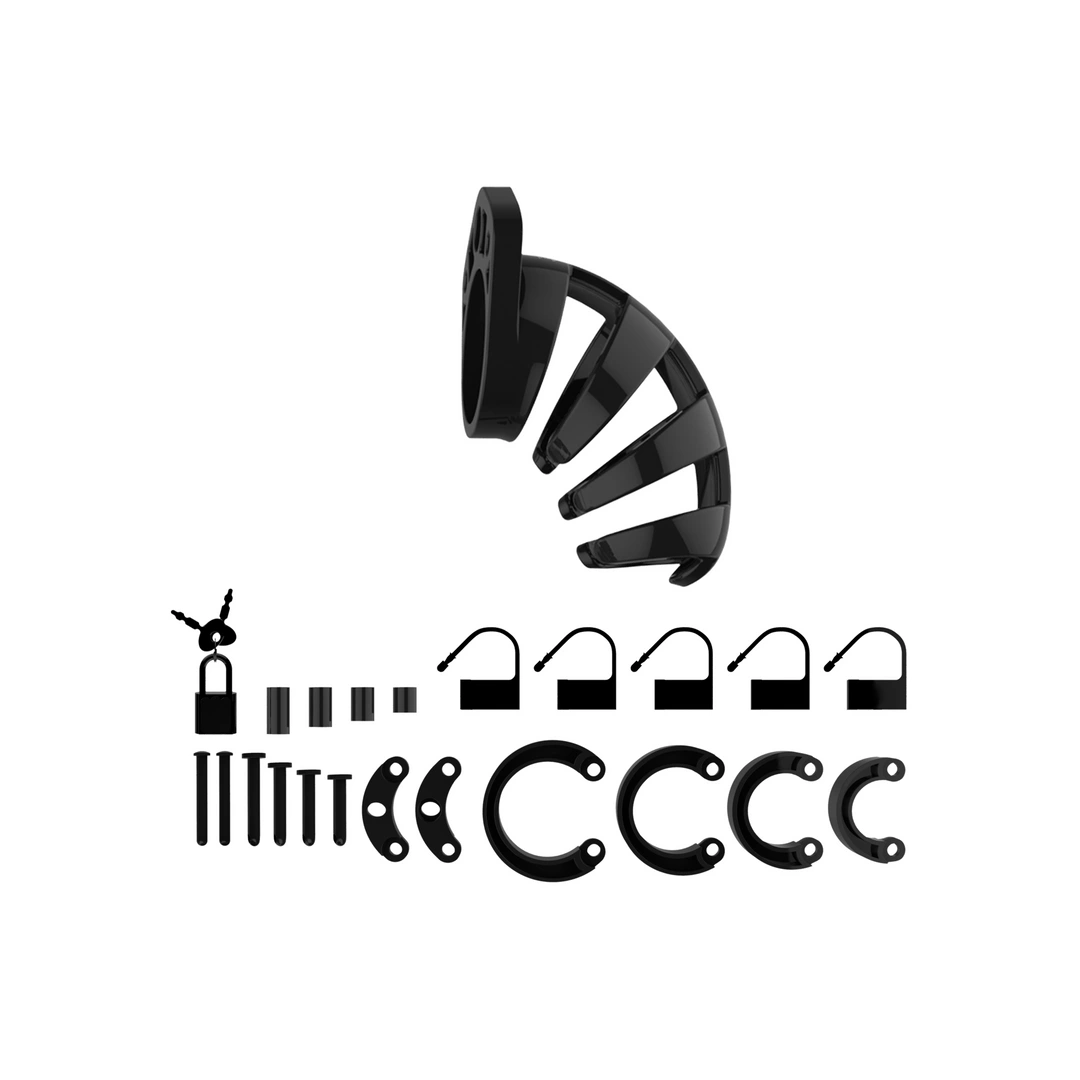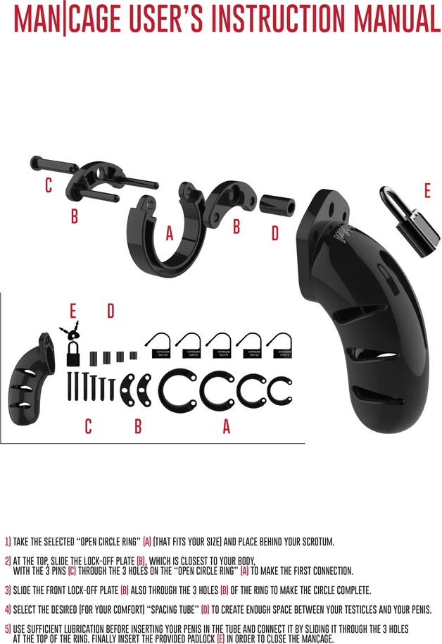 Man|Cage Chastity Cages proizvedeni su od visokokvalitetnog polikarbonata, vrlo laganog, izdržljivog i hipoalergenog materijala. Kavez se sastoji od tri dijela koji savršeno pristaju jedan uz drugog. Dva klina za navođenje povezuju gornje dijelove, a ovalni konusni klin povezuje prstenove s kavezom.