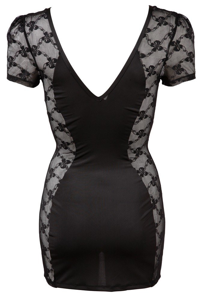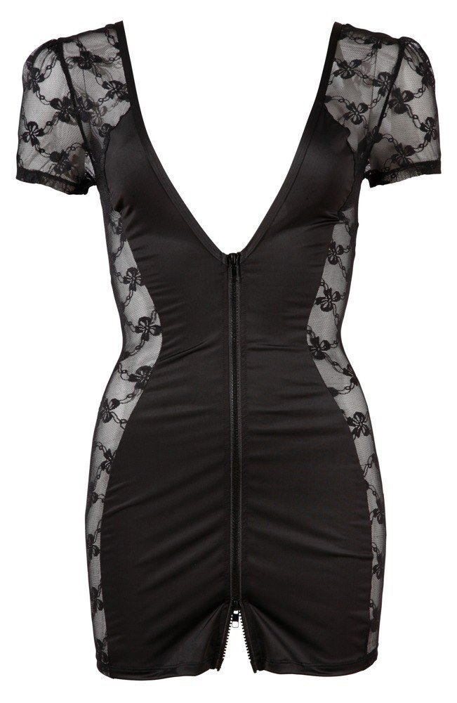 Crna, uska mini haljina s nježnom čipkom sa strane. S kratkim rukavima, dubokim izrezom sprijeda i straga i dvosmjernim patentnim zatvaračem sprijeda. Boja: crna. Materijal: 60% poliester, 30% poliamid, 10% elastan.