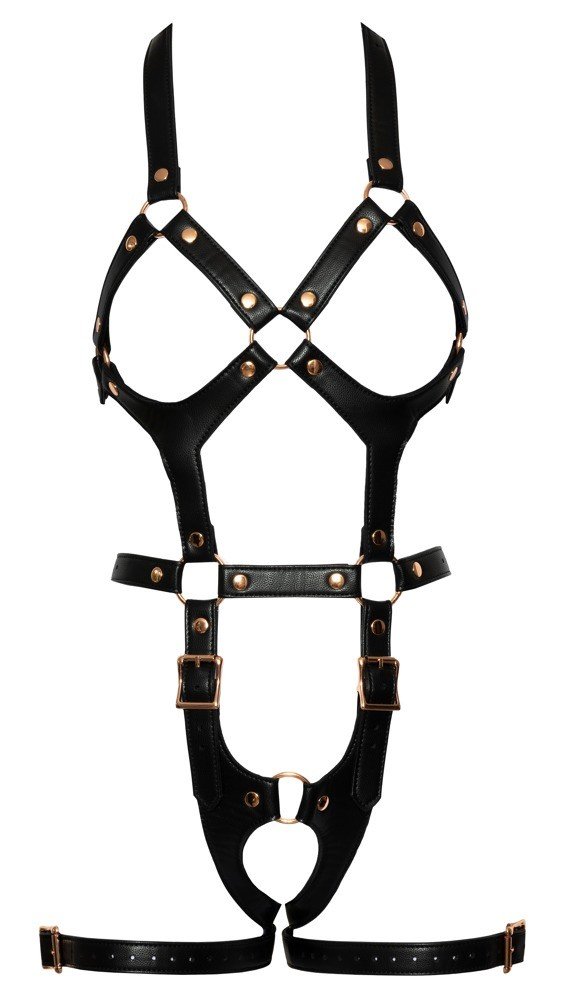 Jednodijelni kombinezon bez prsa s halter izrezom, otvorenim međunožjem i naramenicama na bedrima.