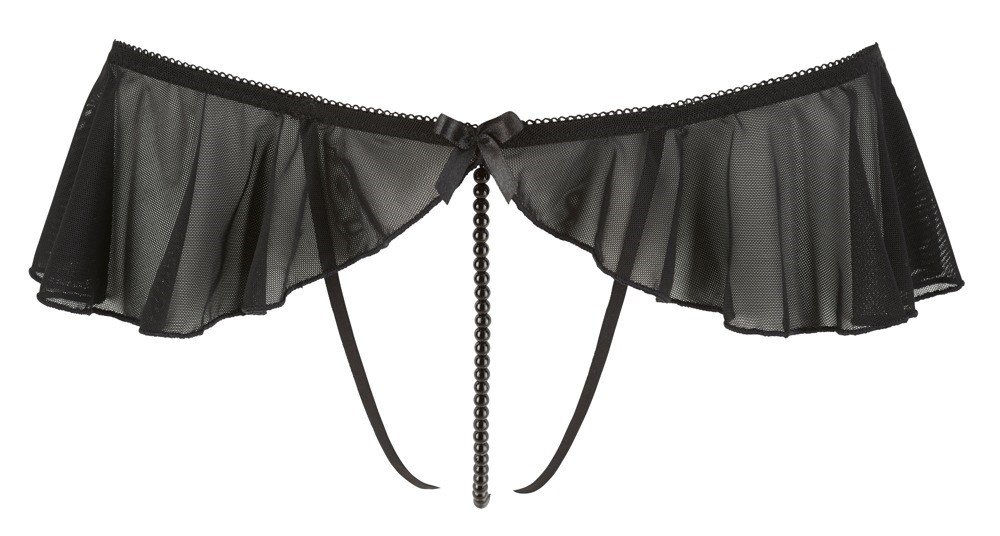 Zavodljive tange iz Cottelli Collection Lingerie posebne su po svom dizajnu – umjesto klasičnog trokuta od tkanine, sadrže dvije elastične trake i niz bisera na međunožju za dodatnu senzualnost. Poluprozirni volan u obliku figure pruža dašak elegancije i ženstvenosti.