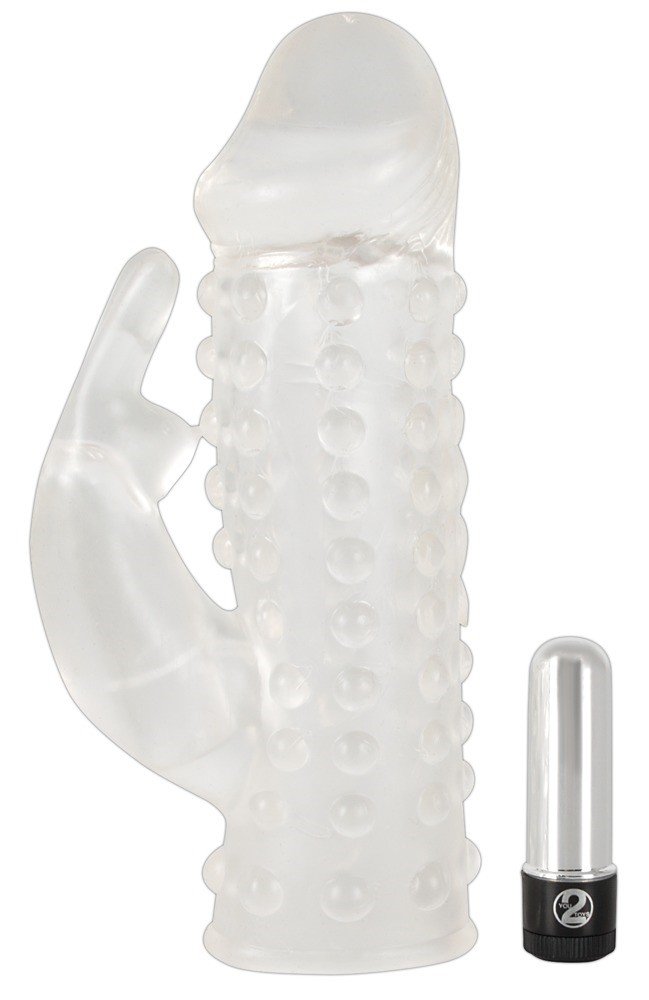 Prozirni naglavak za penis sa stimulatorom klitorisa u obliku zeca i vibracijama. Izvana s izbočinama, iznutra glatka. Produžen za 4 cm. Odvojivi minivibrator. Ukupna duljina 17 cm, Ø 3,2 cm (savitljiva). Materijal: TPE, ABS (bez ftalata). Baterije uključene.