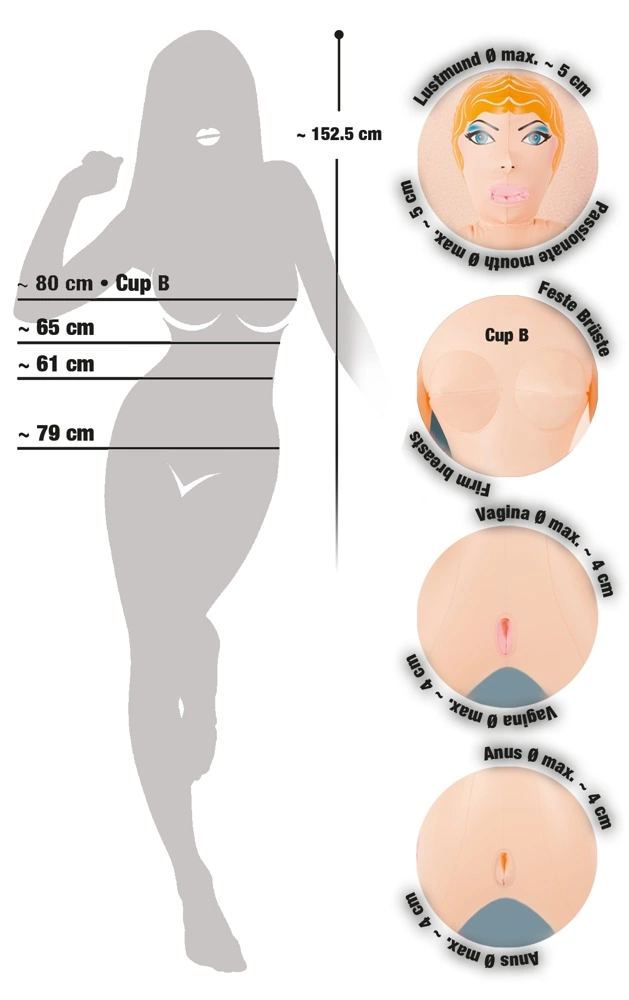 Kompletna dužina 152,5 cm, dubina umetanja vagine 11 cm, dubina umetanja anusa 13 cm, dubina umetanja usta 11,5 cm. PVC.